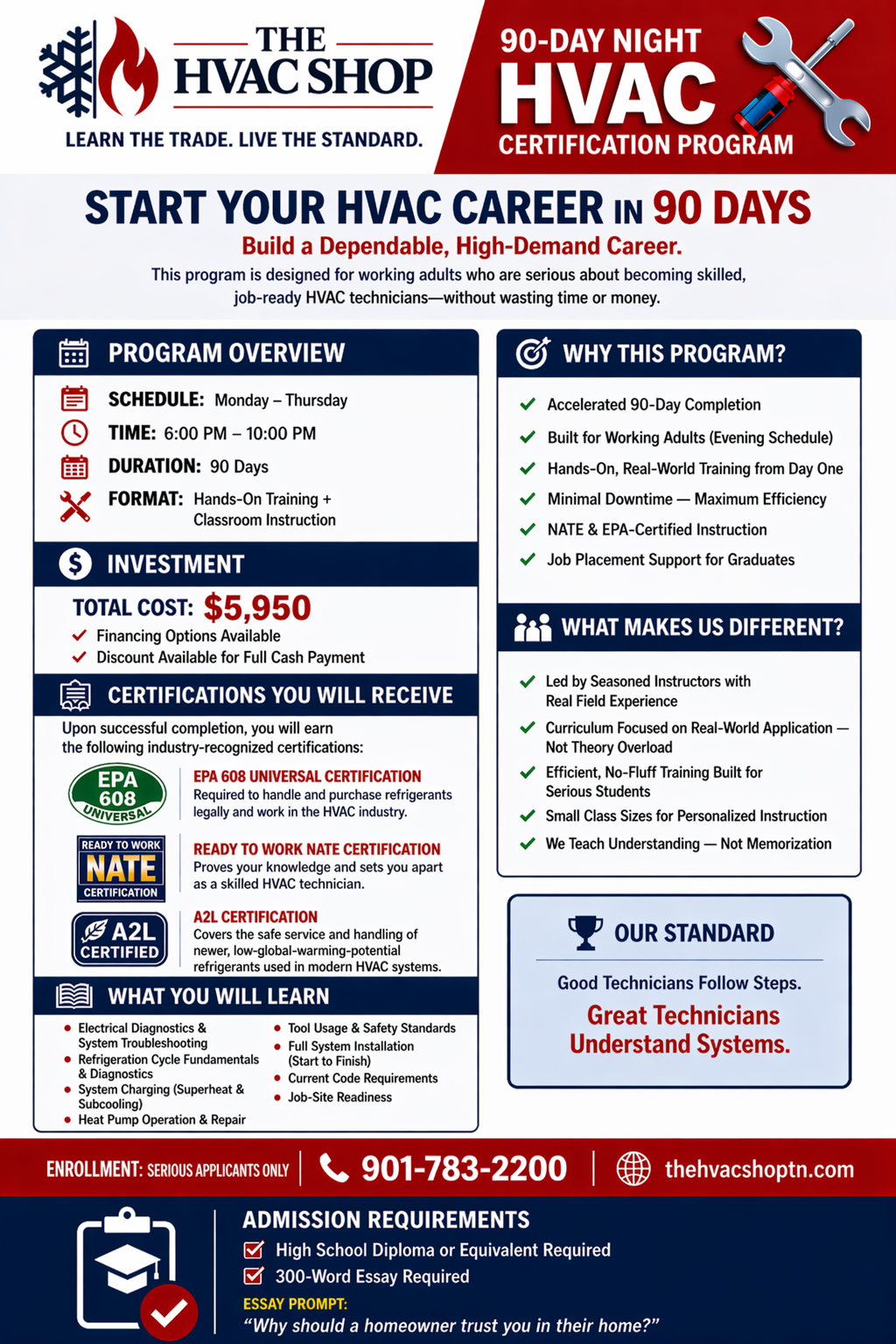 The HVAC Shop Career Training LLC is dedicated to transforming working adults into confident, certified HVAC technicians. Our intensive 90-day program is specifically designed for busy professionals who want to jumpstart a high-demand career without sacrificing their current commitments. Through evening classes and hands-on experience with real equipment, we provide the practical skills and industry certifications needed to excel in the HVAC field.